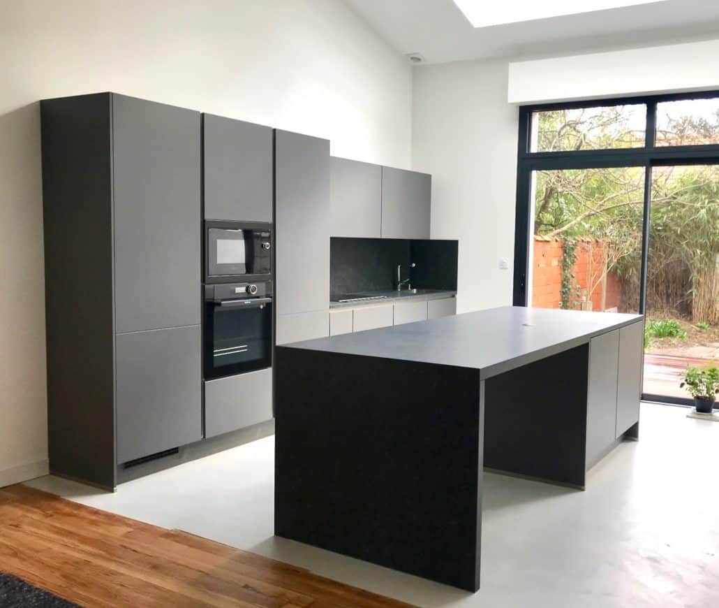 Notons les finitions choisies : des façades super-mat gris ardoise et des meubles sans poignées grâce au principe des gorges courant le long des linéaires et permettant d’obtenir une finition minimaliste et pure.